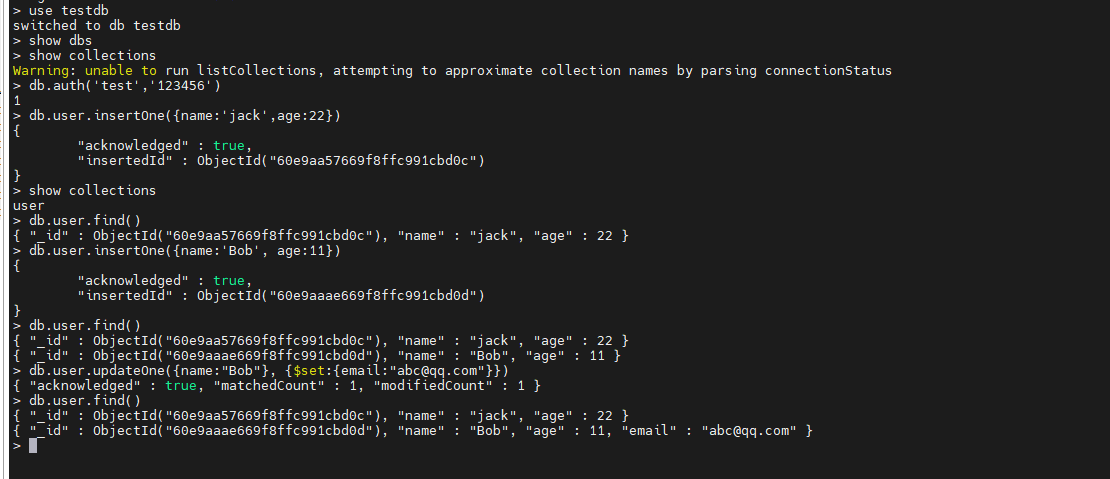 docker exec -it mongotest_mongo_1 mongo - 新建testdb数据库: