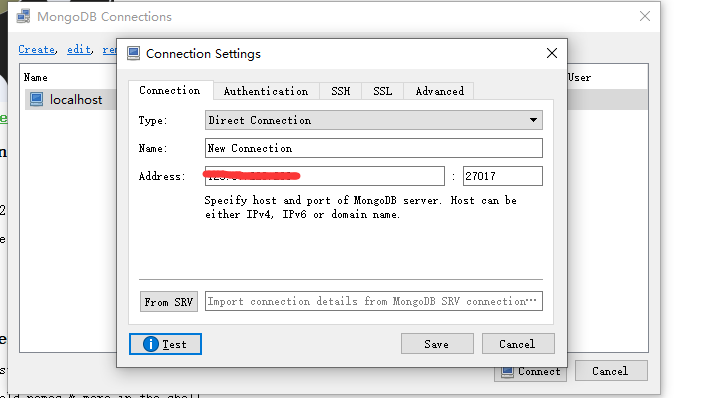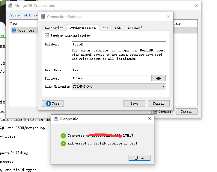 - 使用GUI工具Robo3T连接成功,注意防火墙放行27017端口,同时注意云服务器的防火墙端口放行规则