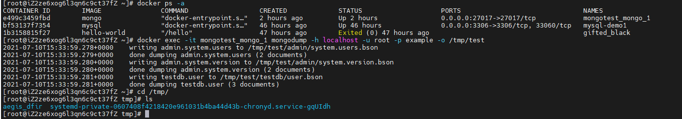docker exec -it mongotest_mongo_1 mongodump -h localhost -u root -p example -o /tmp/test-h == –host MongoDB所在服务器地址