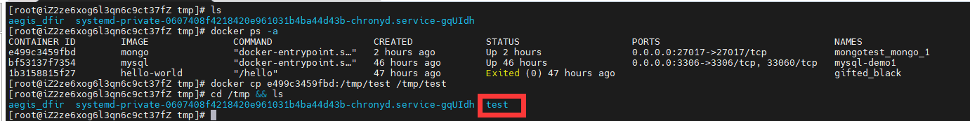 docker cp e499c3459fbd:/tmp/test /tmp/test - 查看结果: