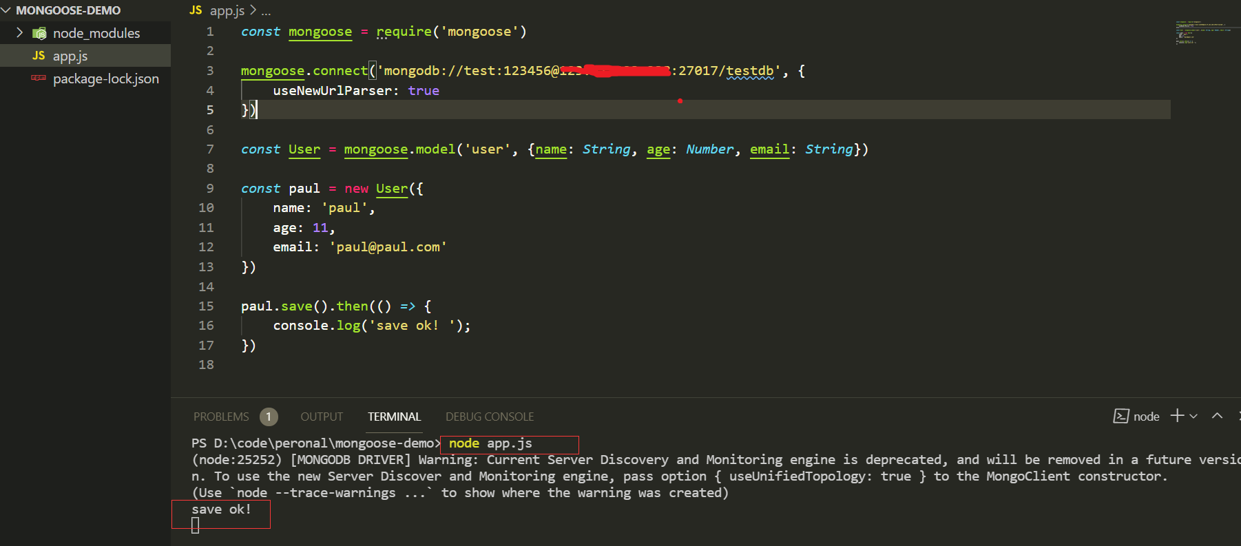 npm install -S mongoose - 新建 app.js 文件,写入如下内容
