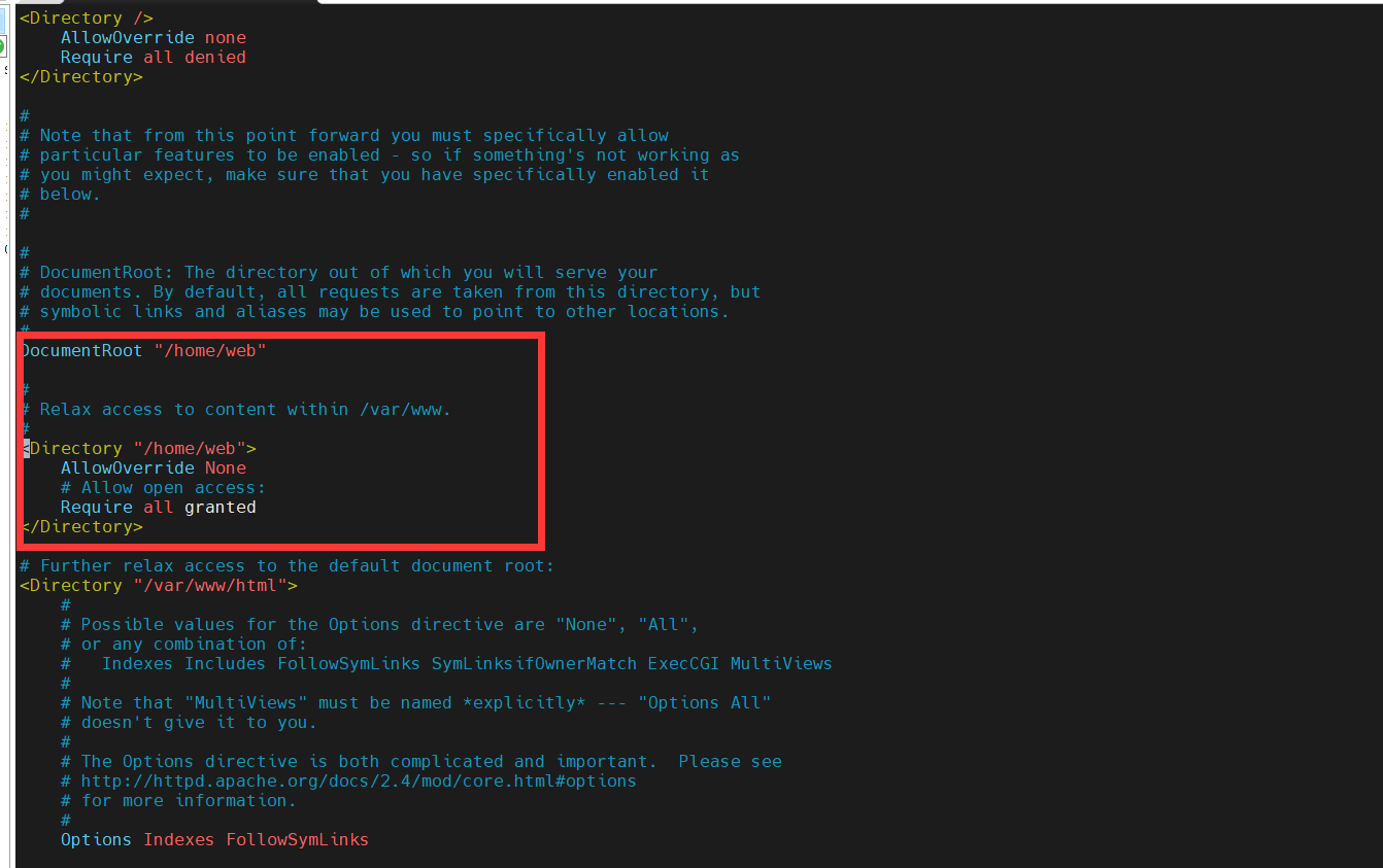 - 紧跟着将 <Directory “/var/www/html”> 修改为 <Directory “/home/web”> 保存退出