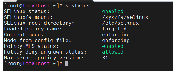 sestatus查看状态 (或者使用sestatus -v显示更多信息)