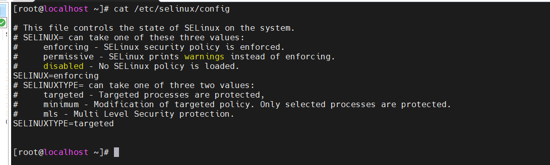 cat /etc/selinux/config查看配置,可以直接修改此配置文件,但是要等系统下次启动时才能生效